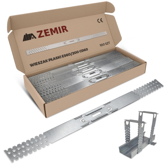 Wieszak ES 200 mm Wieszak ES 200 mm/0.8mm to wytrzymały element montażowy do sufitów podwieszanych, przeznaczony do konstrukcji wymagających większego obniżenia. Zapewnia stabilne i pewne mocowanie profili CD w systemach suchej zabudowy.